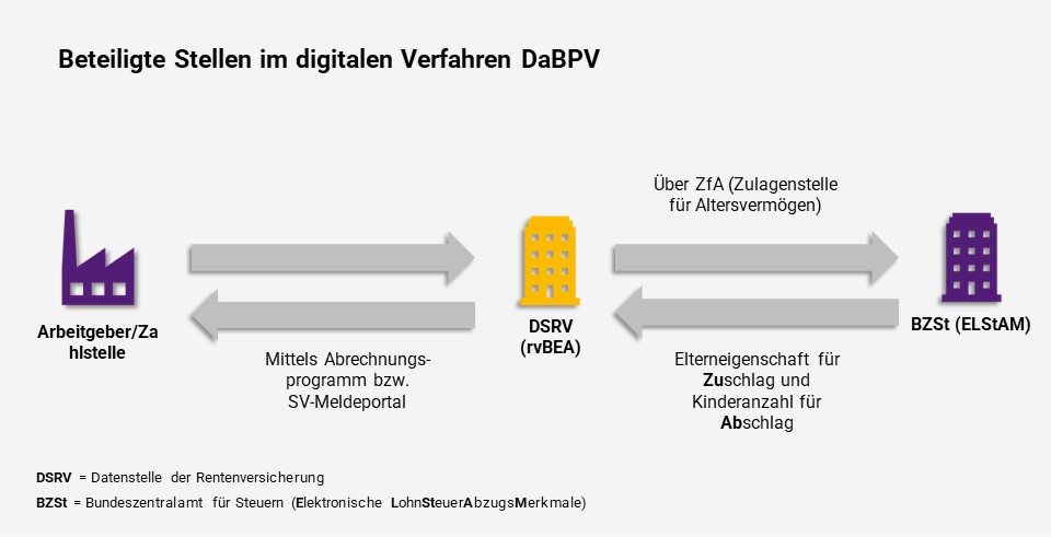 Das Bundeszentralamt für Steuern (BZSt), der Spitzenverband Bund der Pflegekassen und die Deutsche Rentenversicherung Bund haben die Gemeinsamen Grundsätze vom 29. August 2024 aufgestellt. Danach gilt (Ziffer 1.2): „Die Teilnahme am DaBPV ist für alle beitragsabführenden Stellen, die zur Berücksichtigung von Zu- und Abschlägen in der sozialen Pflegeversicherung verpflichtet sind, obligatorisch.“ Die Gemeinsamen Grundsätze (sowie nach deren Finalisierung später auch die von der ZfA aufzustellende Verfahrensbeschreibung) können wertvolle Unterstützung beim Start in das neue Verfahren leisten.