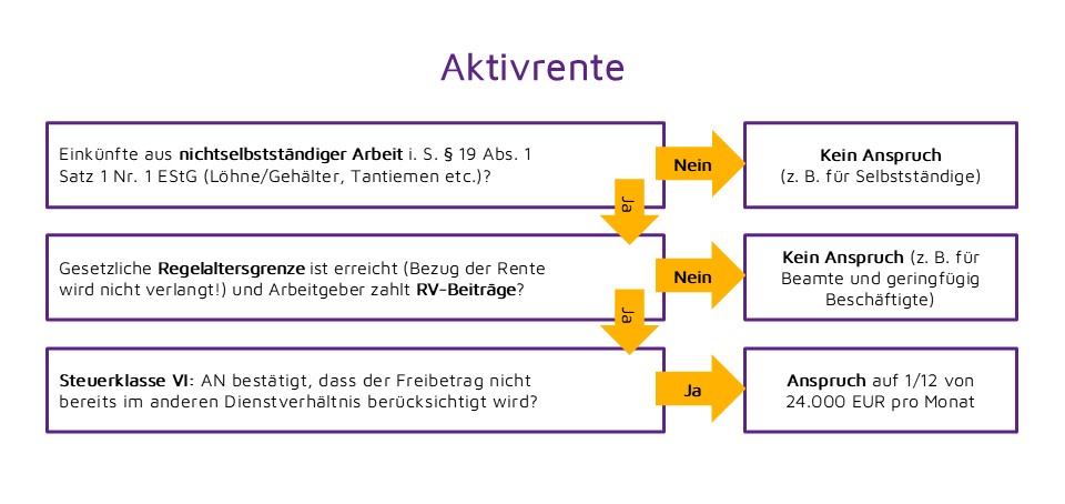 Im Übrigen gilt die Steuerfreiheit unabhängig vom Bezug einer Regelaltersrente (i. S. § 35 oder § 235 SGB VI) oder von Versorgungsbezügen (i. S. 19 Abs. 2 Satz 2 Nr. 1 EStG) wegen Erreichens einer Altersgrenze. Es muss keine Prüfung des Bezugs von Alterseinkünften vorgenommen werden, wodurch die Regelung verfahrenstechnisch einfach zu handhaben sein soll.