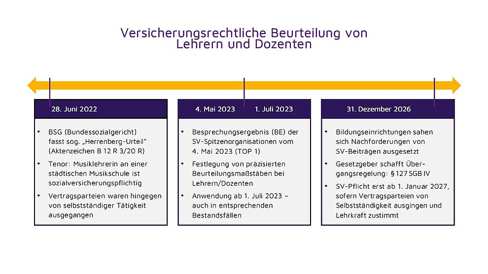 Nach der Übergangsregelung in § 127 SGB IV soll eine Feststellung des Sozialversicherungsstatus von Lehrkräften als abhängig beschäftigt durch die Sozialversicherungsträger bis zum 31. Dezember 2026 ohne Wirkung bleiben; d. h. die Versicherungspflicht soll erst ab dem 1. Januar 2027 beginnen. Dies gilt immer dann, wenn